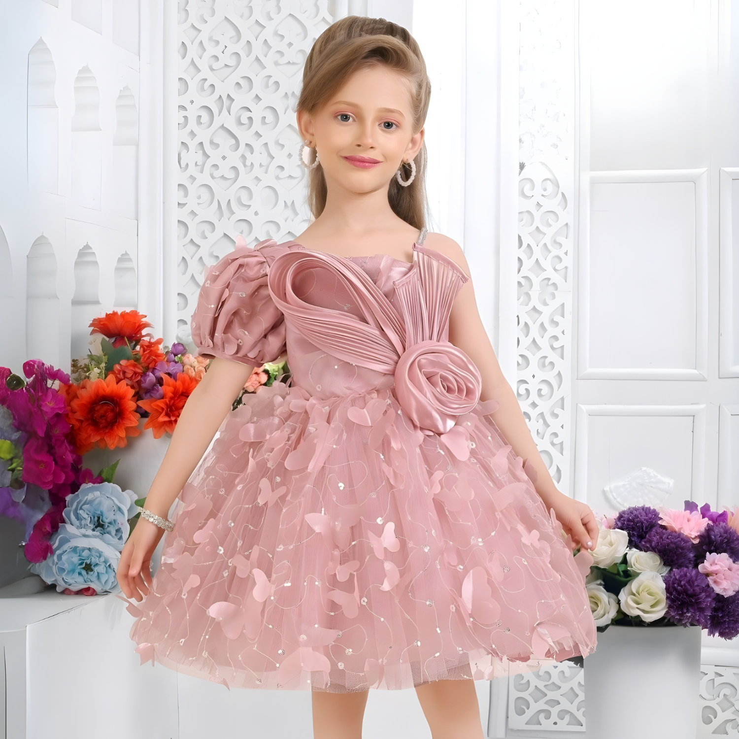 This pink one-shoulder glitter frock features a sleek asymmetric design that highlights elegance and modern style. Its shimmering fabric adds a festive sparkle, perfect for making a statement at any special event.
