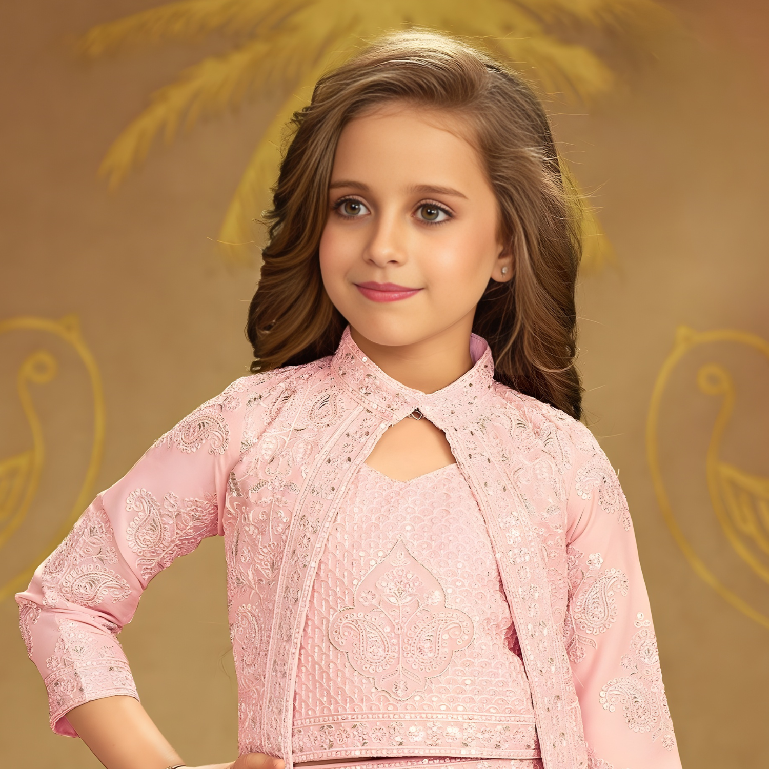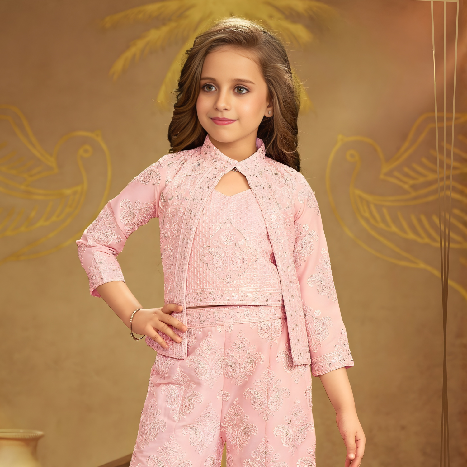 Pink Palazzo Set with Crop Top and Matching Jacket For Girls