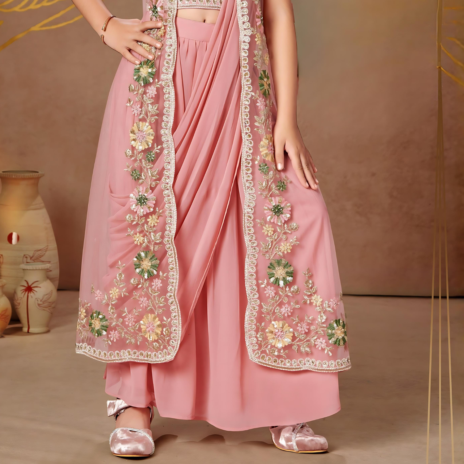 Elegant pink lehenga choli crafted from luxurious soft georgette. Perfect for weddings with graceful drape and comfort.
