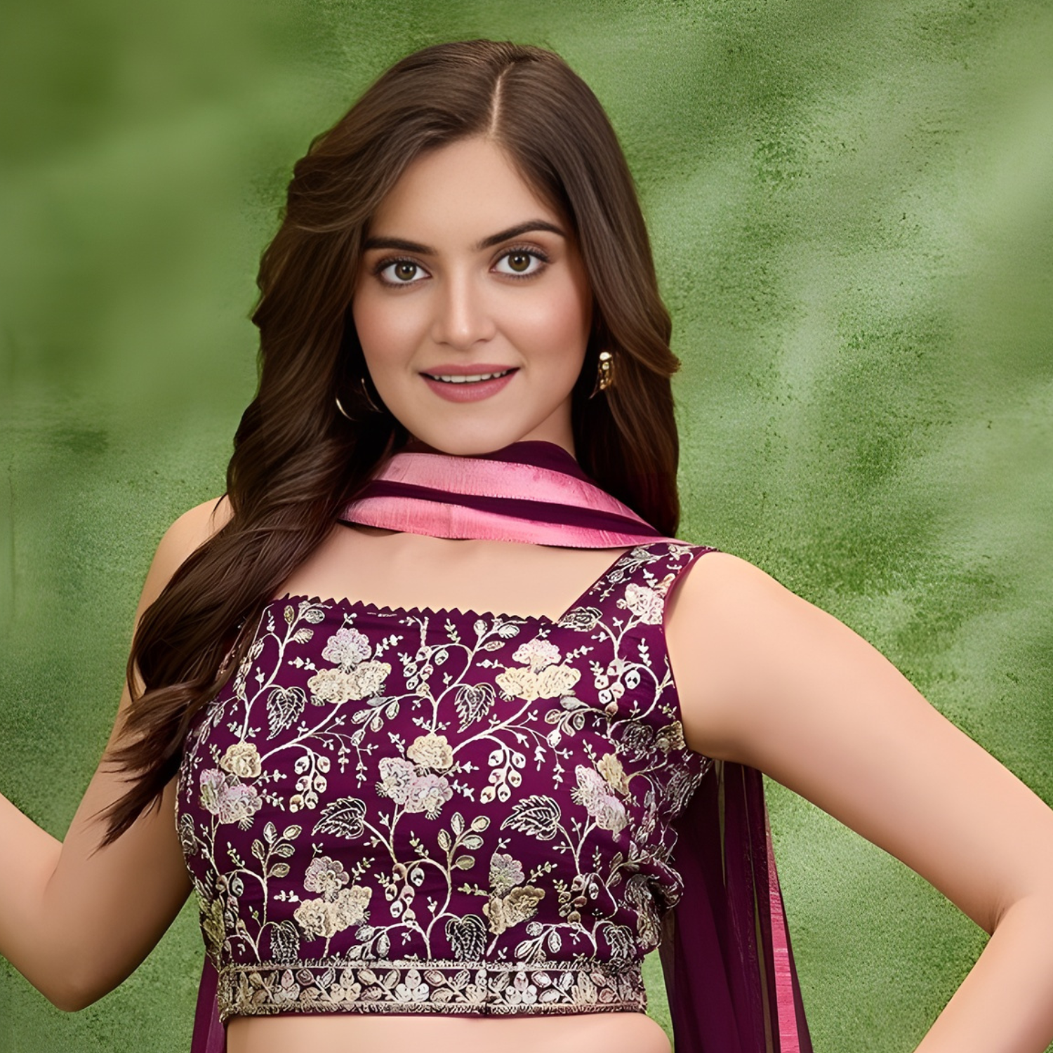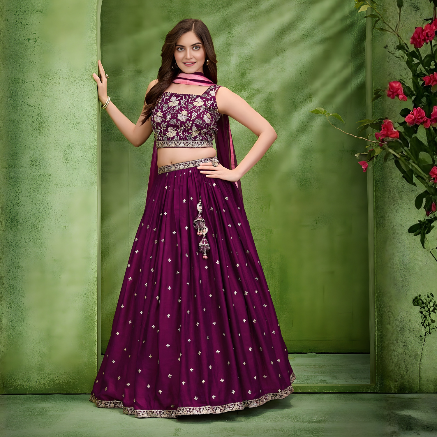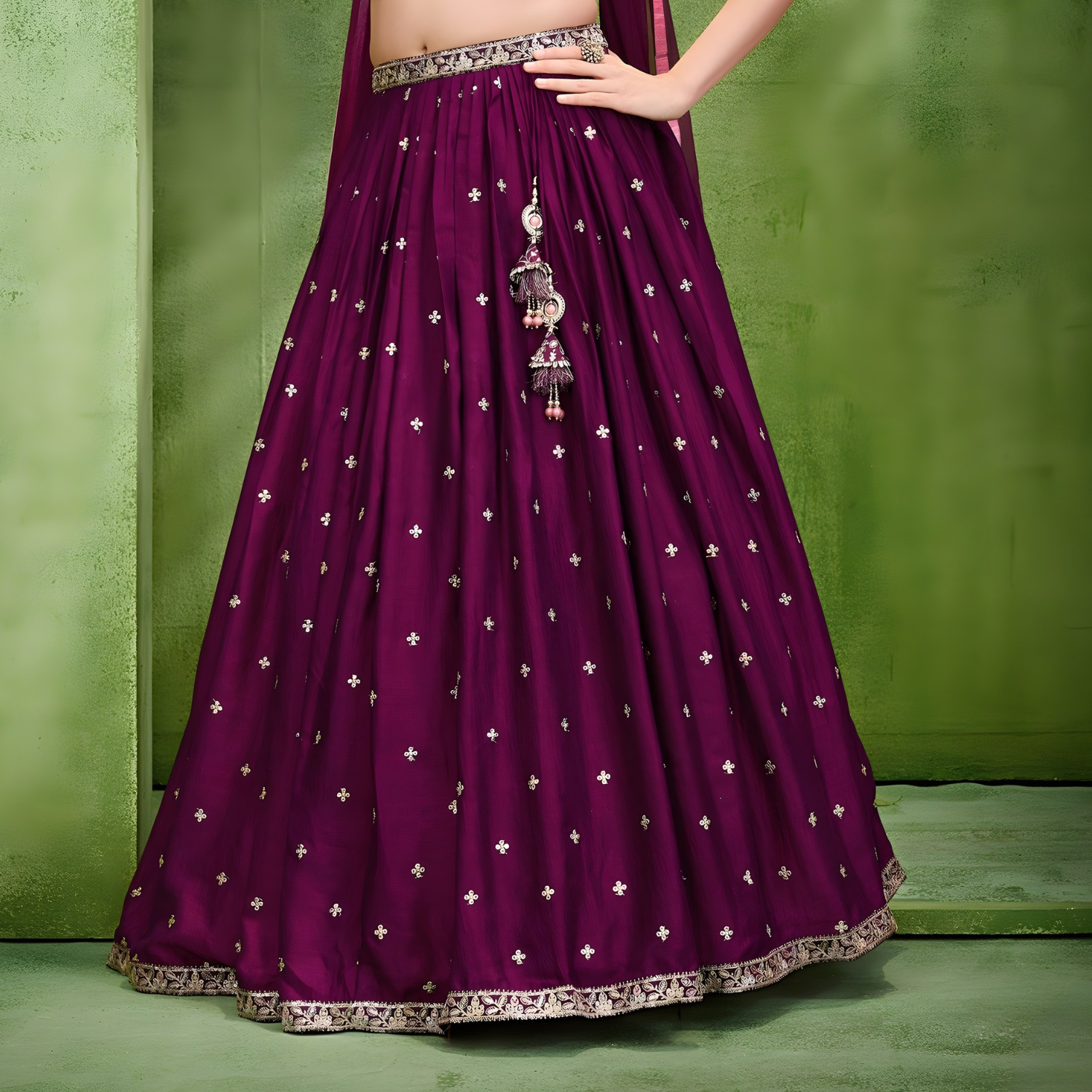 Elegant wine-colored lehenga choli set featuring intricate embroidery with matching dupatta. Perfect for celebrations and special occasions.