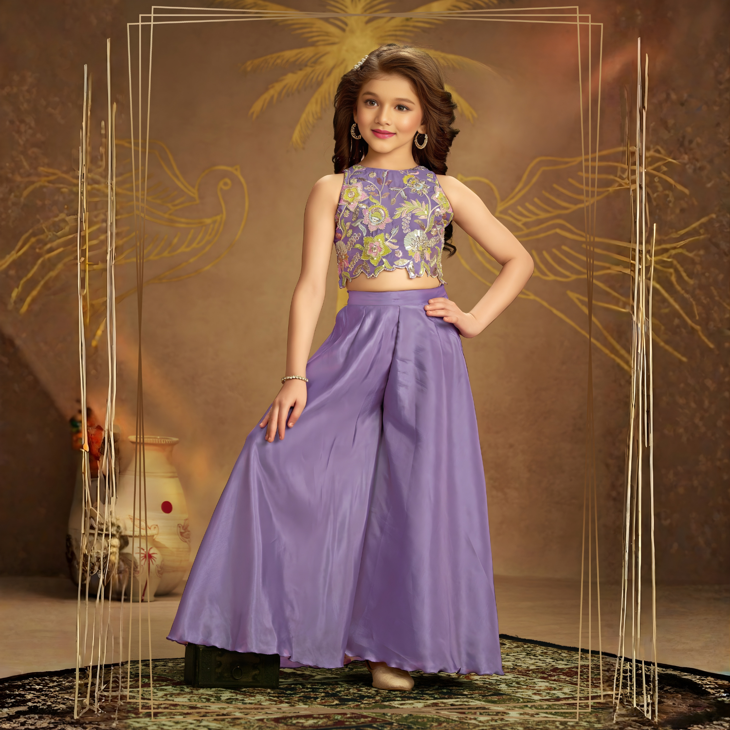 Purple Sequins, Thread work Palazzo Suit Set For Girls
