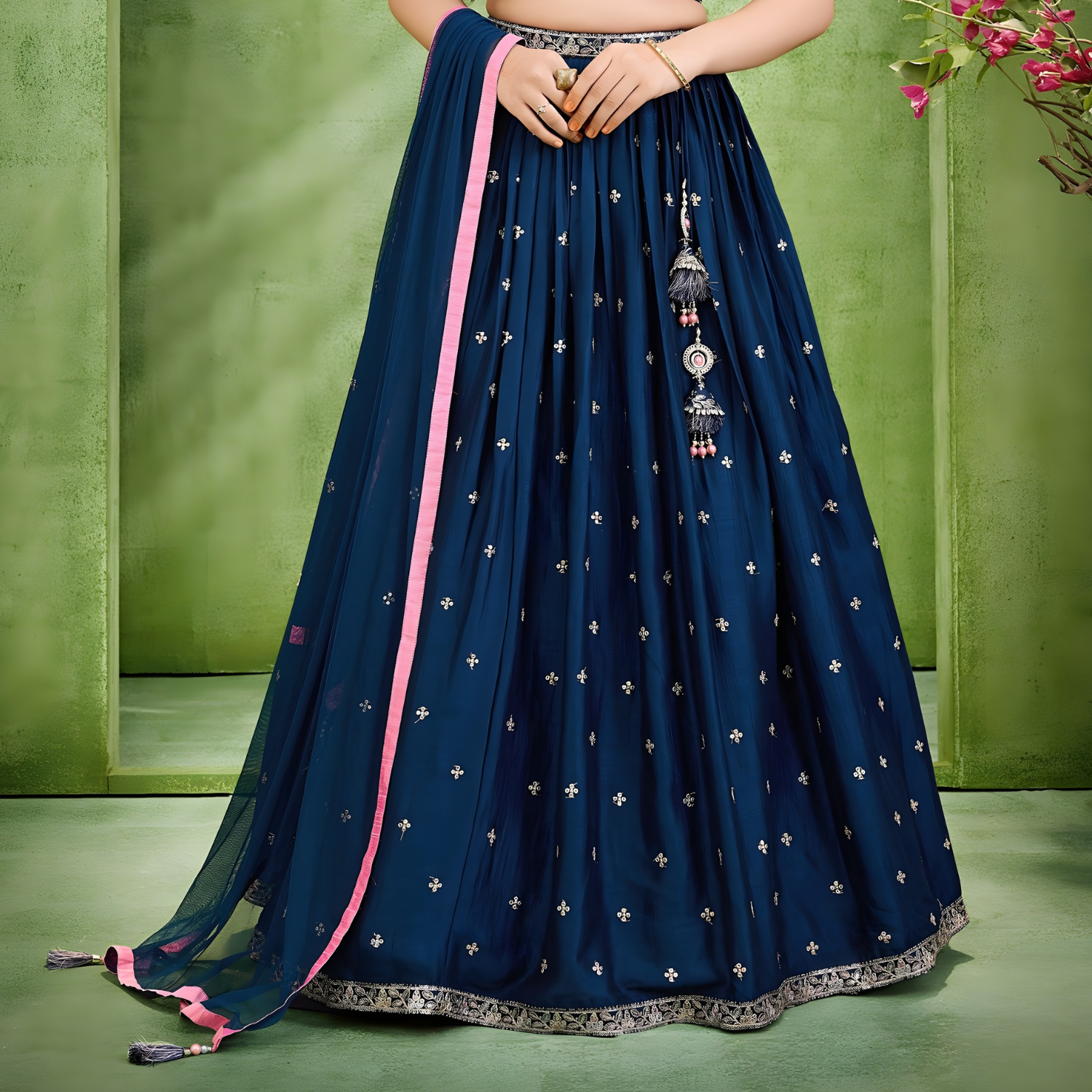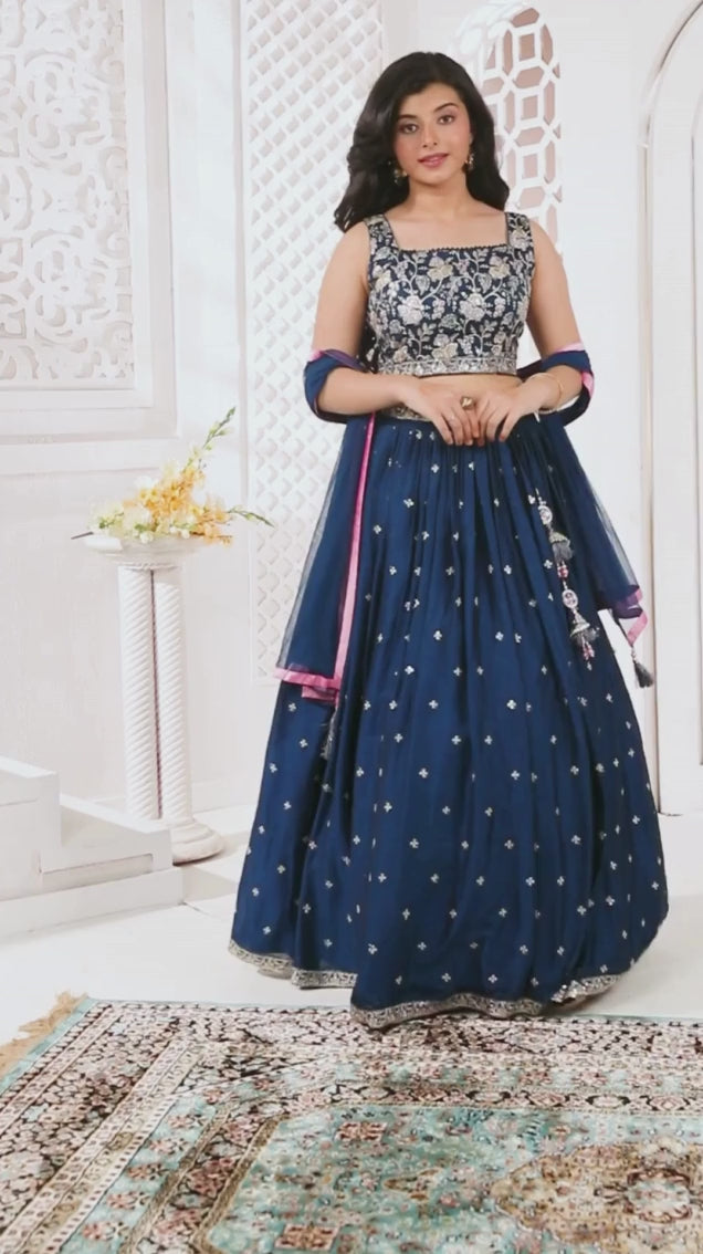 Exquisite Rama blue silk lehenga choli adorned with sparkling embellishments. Perfect for weddings and celebrations with timeless elegance,