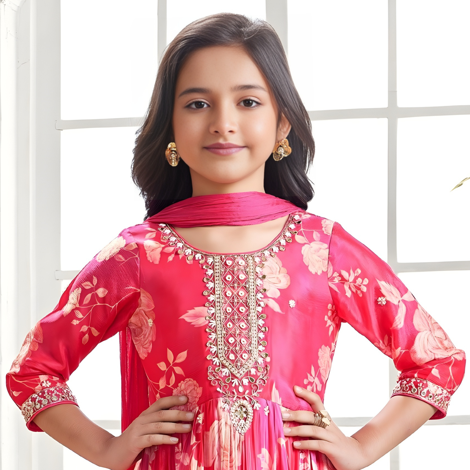 Elegant rani-colored sharara set featuring intricate floral embroidery. Perfect for celebrations and special occasions. Comfortable fit for girls.