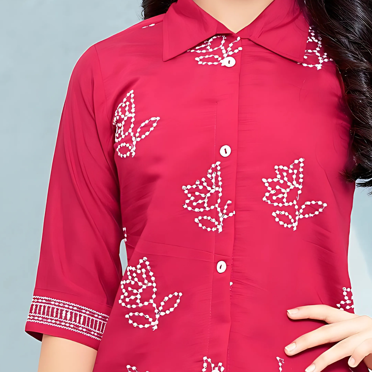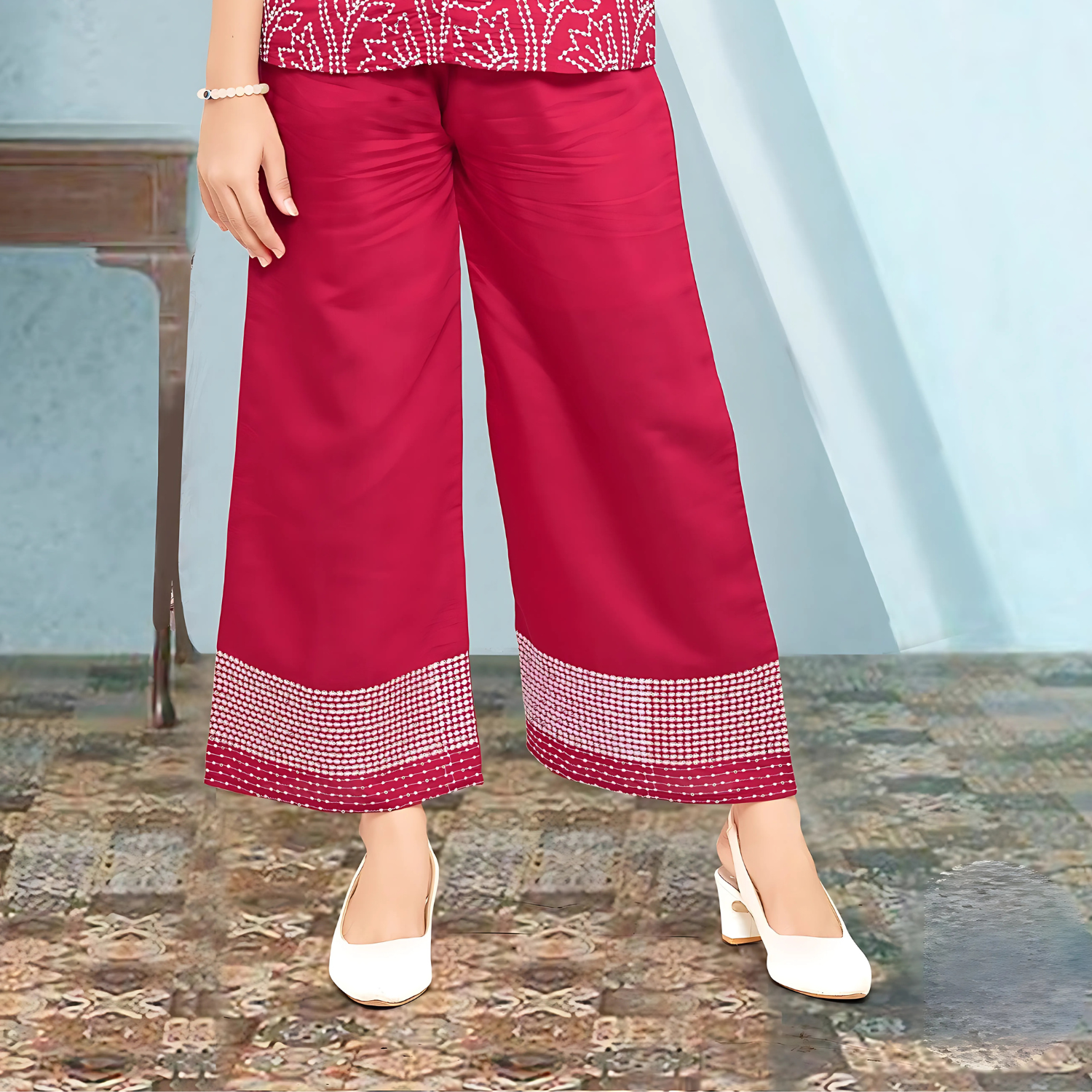 This Rani printed silk palazzo suit features rich silk fabric with intricate prints, perfect for festive celebrations. Designed for elegance and comfort, it highlights a modern silhouette with traditional charm.