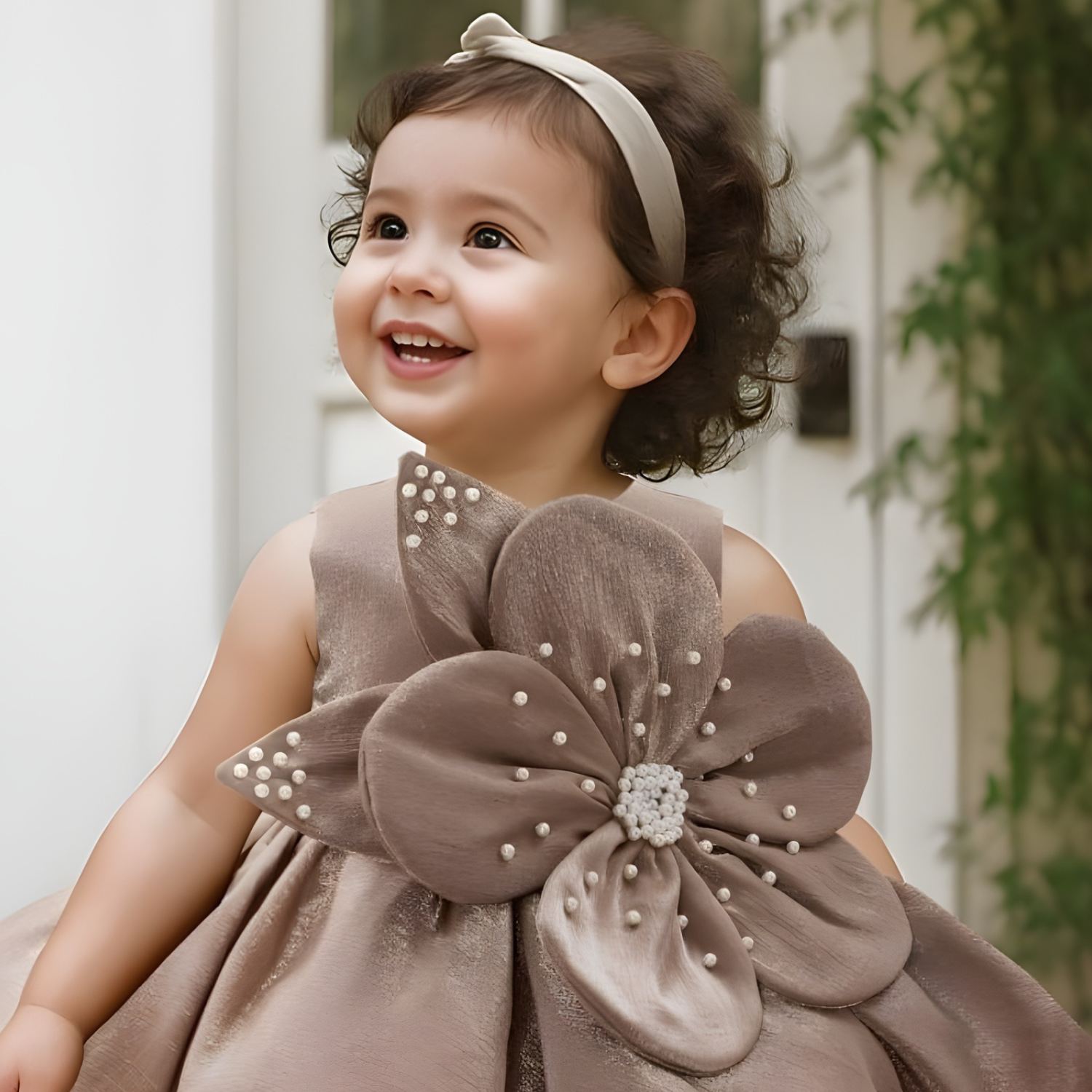 This sleeveless frock for girls features elegant bow detailing and delicate pearl embellishments, combining style and sophistication. Designed for comfort and charm, it’s perfect for special occasions.
