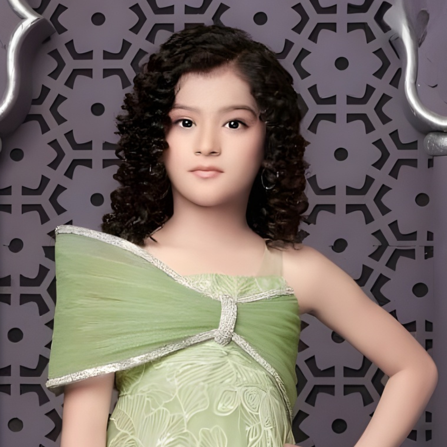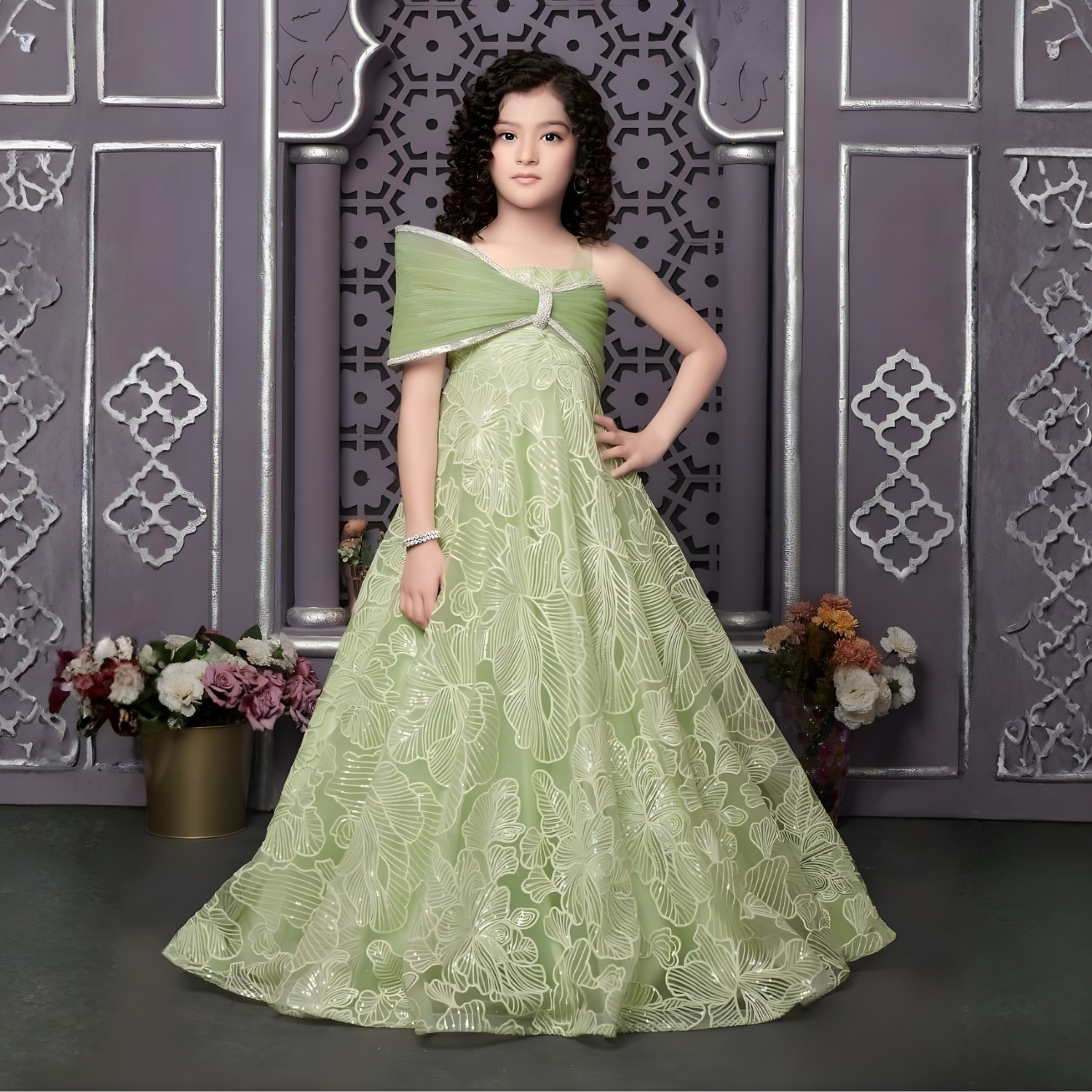 Elegant sleeveless party gown in pista green featuring a charming bow applique detail. Perfect for special occasions and celebrations.