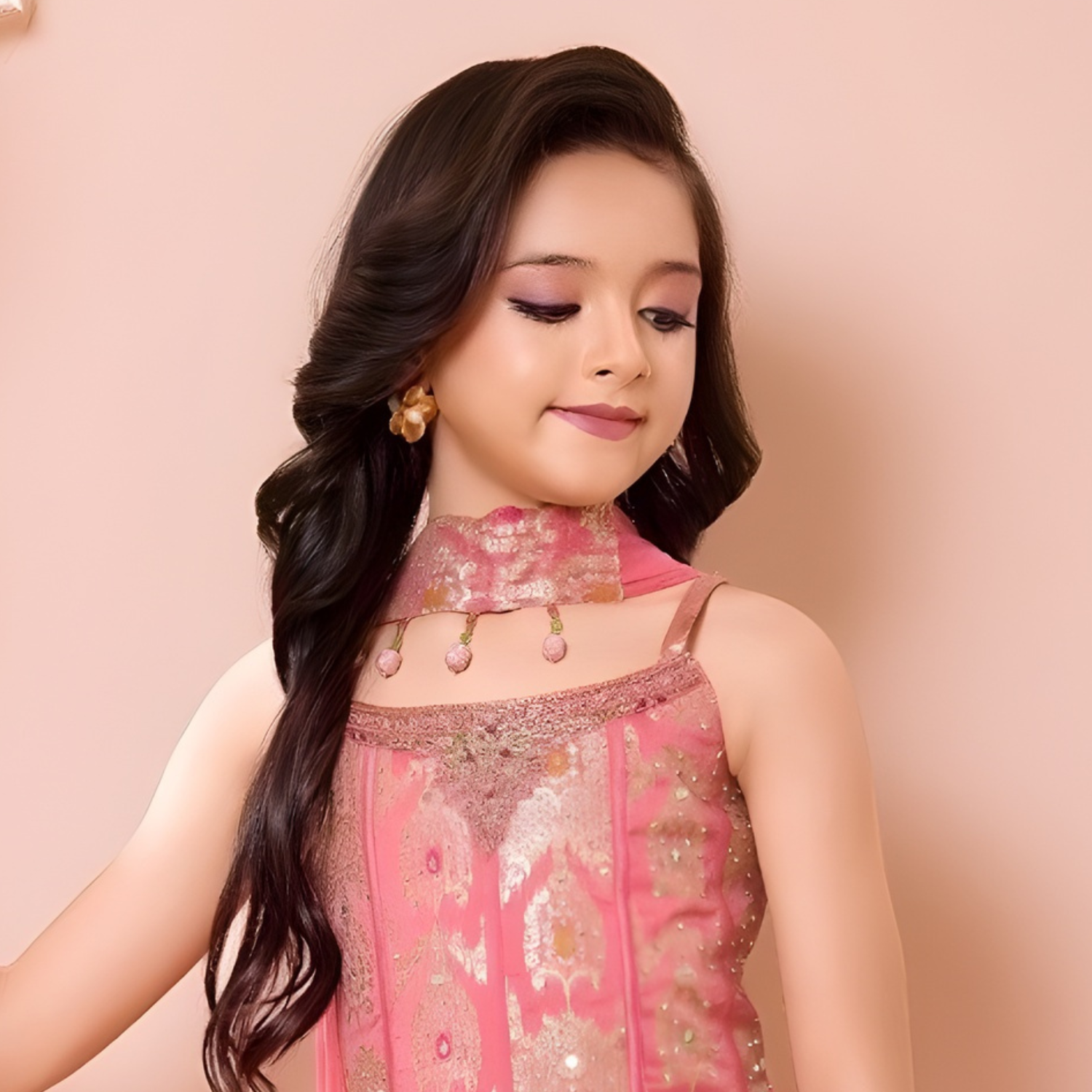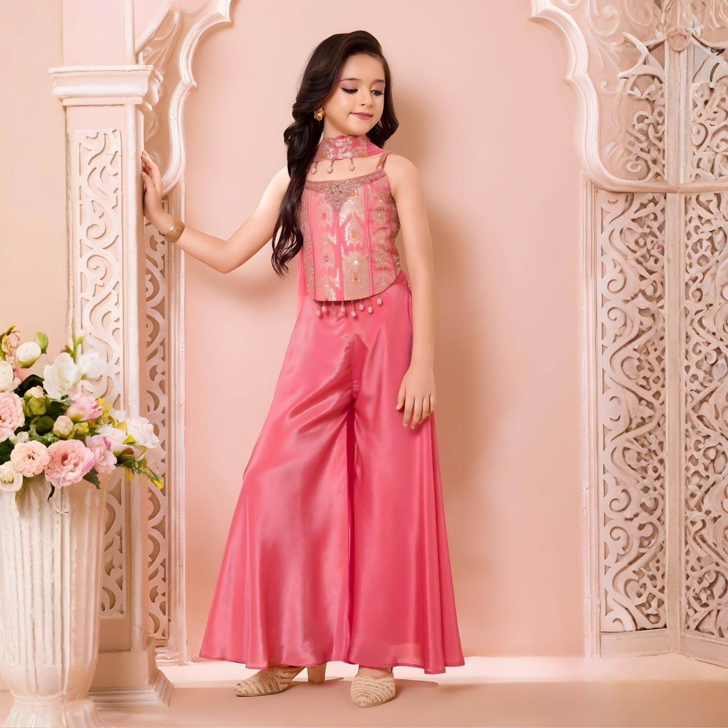 Elegant pink palazzo set perfect for girls' parties. Stylish design combines comfort with sophistication for memorable celebrations.