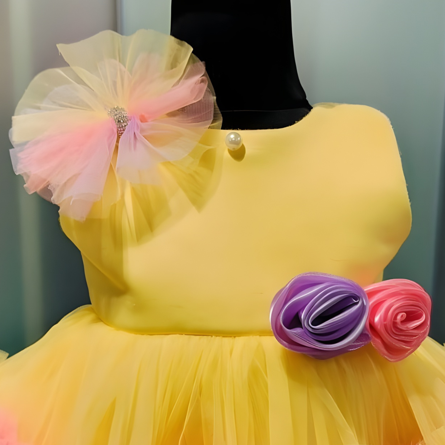 Elegant Yellow frock perfect for celebrations. Lightweight, comfortable design with graceful draping. Ideal for parties and special occasions.