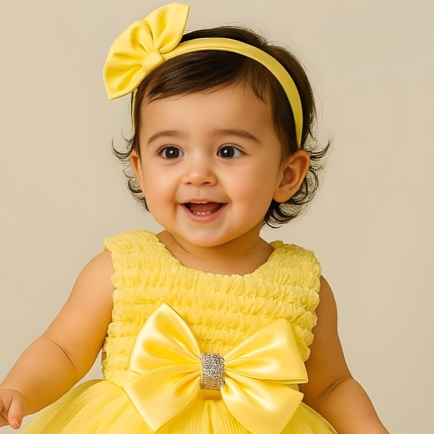 Elegant Yellow frock perfect for celebrations. Lightweight, comfortable design with graceful draping. Ideal for parties and special occasions.