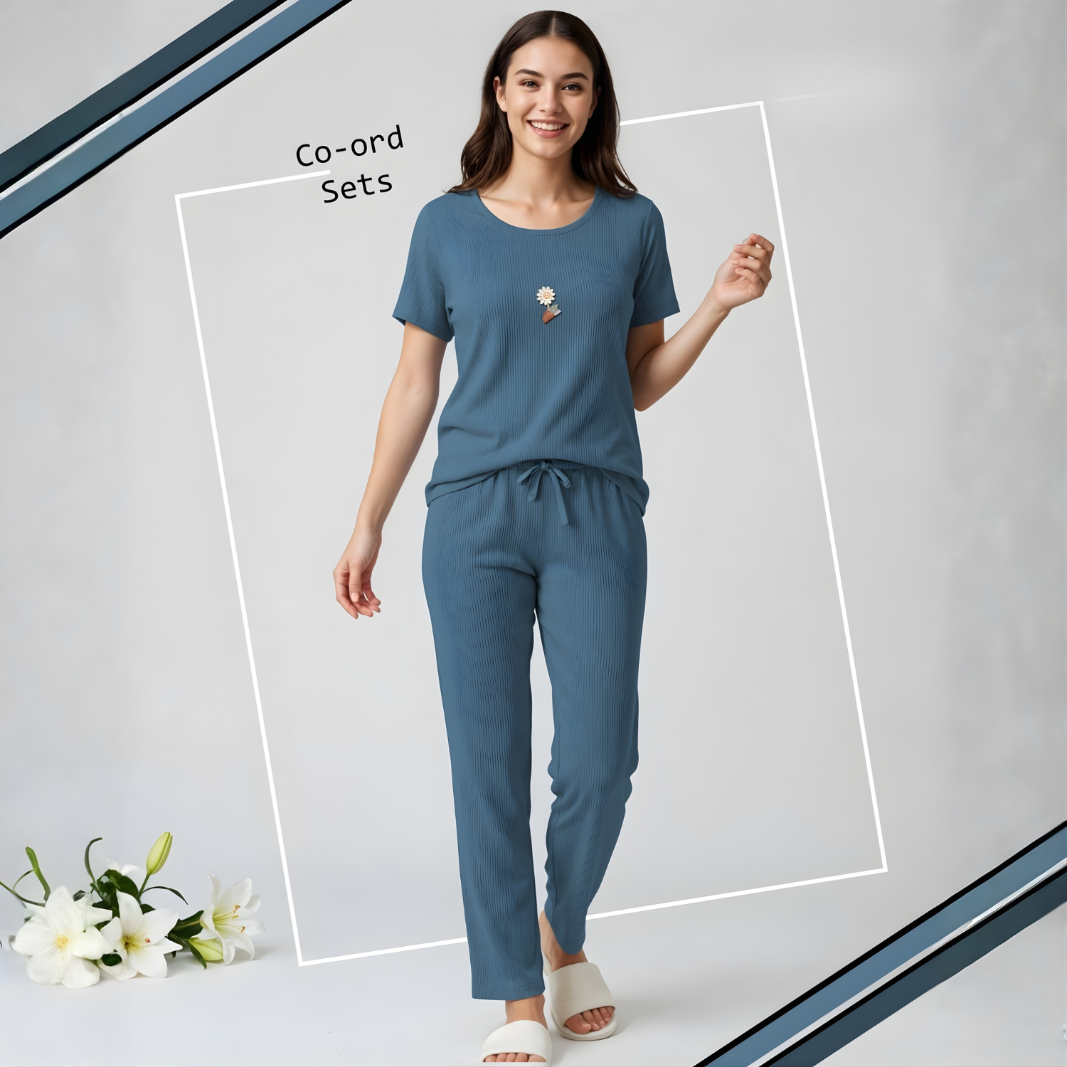 Comfortable Blue night suit with round neckline and half sleeves. Perfect for relaxed evenings and restful sleep in breathable fabric,
