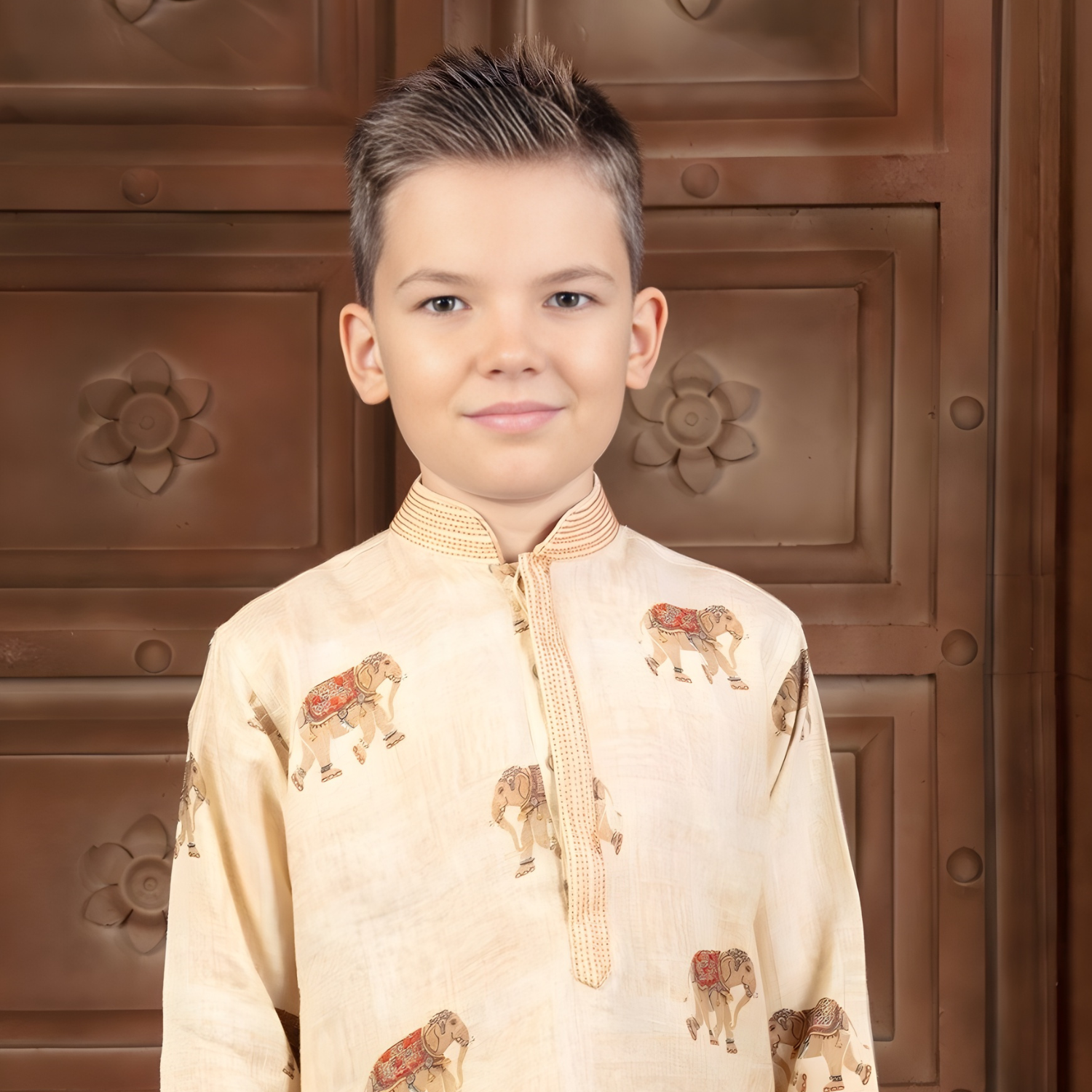 Lightweight Yellow linen kurta suit featuring traditional printed design. Perfect for boys' ethnic wear, celebrations, and everyday comfort with breathable fabric.
