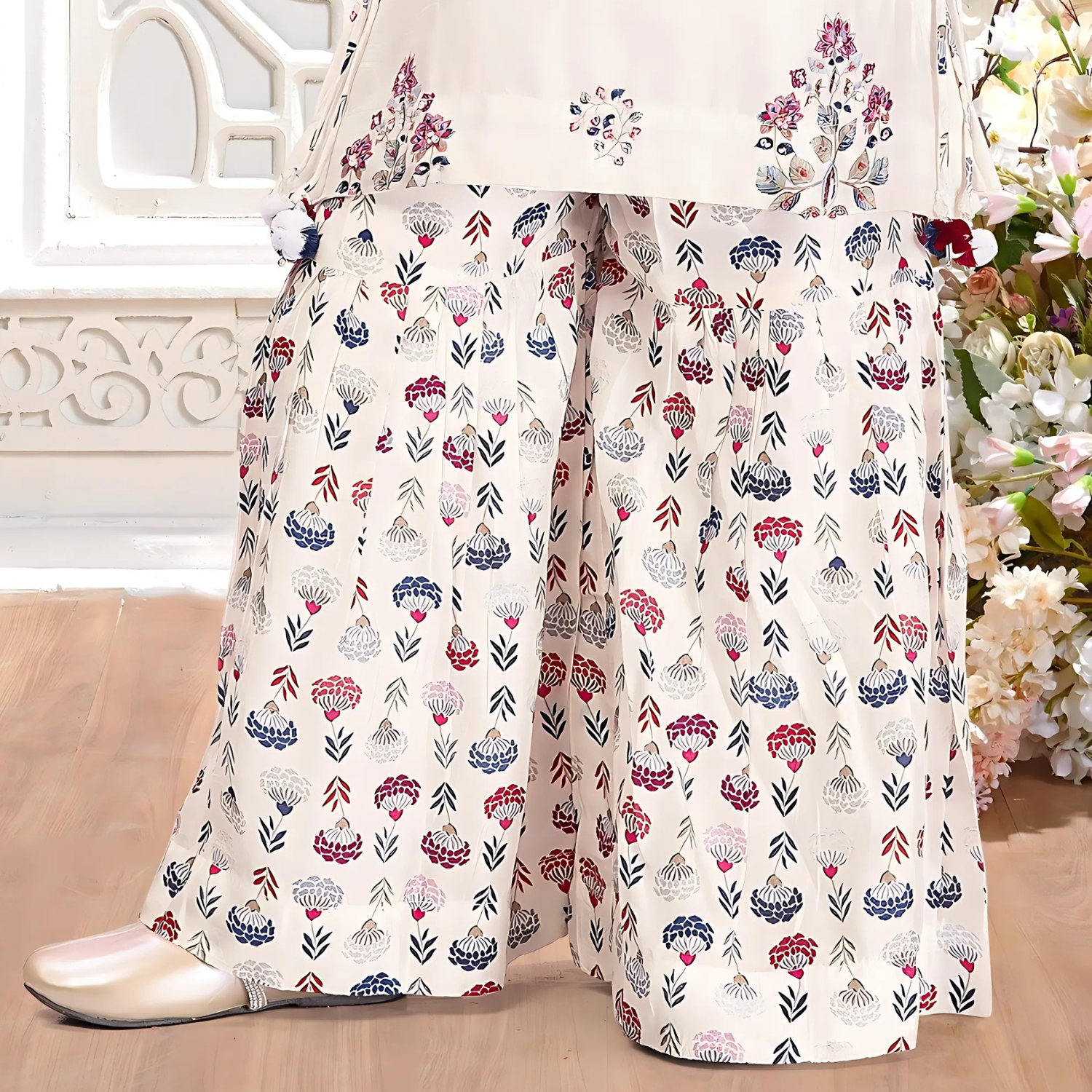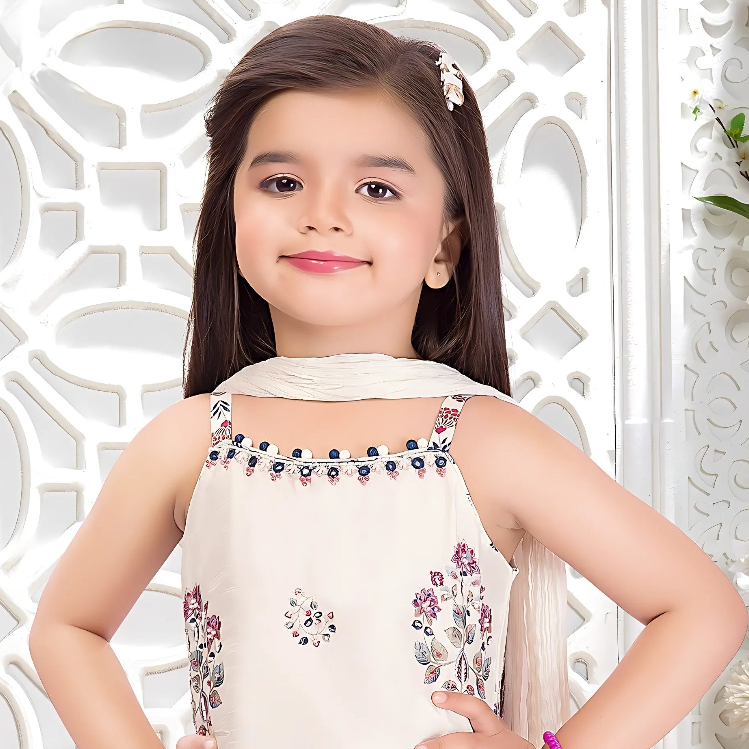 Let your little one embrace comfort and style with this charming white floral print palazzo set. The sleeveless kurta features delicate multi-colored floral motifs and bead detailing along the neckline, offering a bright yet graceful look.Finished with a matching dupatta, this set is perfect for festive gatherings, family functions, and special celebrations.